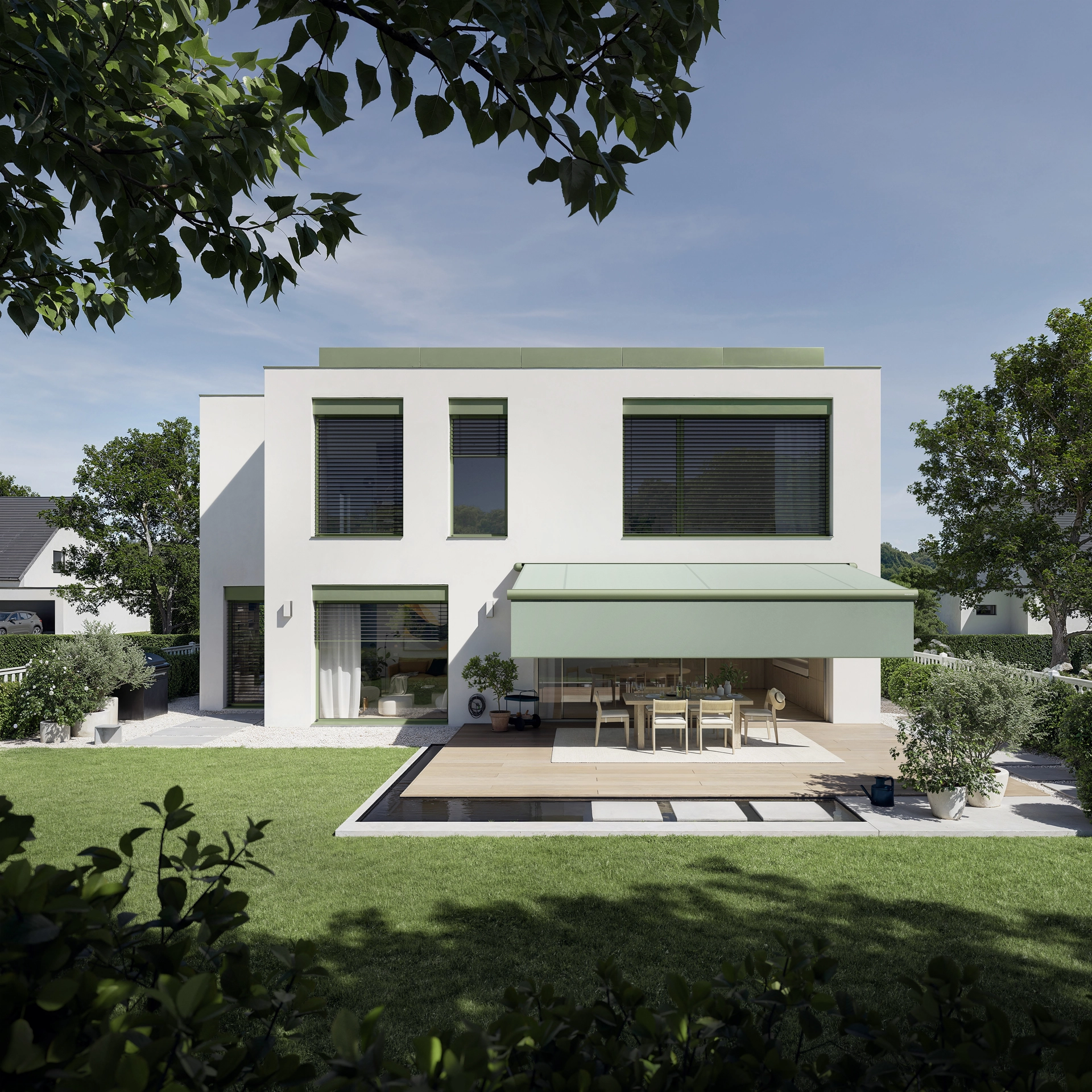 Die Terrea K55 ist mehr als eine Markise. Mit ihrer harmonischen Kombination aus geraden und runden Formen ist sie interessant für kubisch-moderne oder fließend-verspielte Baustile. Sie kann sich dezent integrieren oder gezielt akzentuieren. Ob Neubau oder Modernisierung – die Terrea K55 bietet die Freiheit, den persönlichen Stil zu verwirklichen.